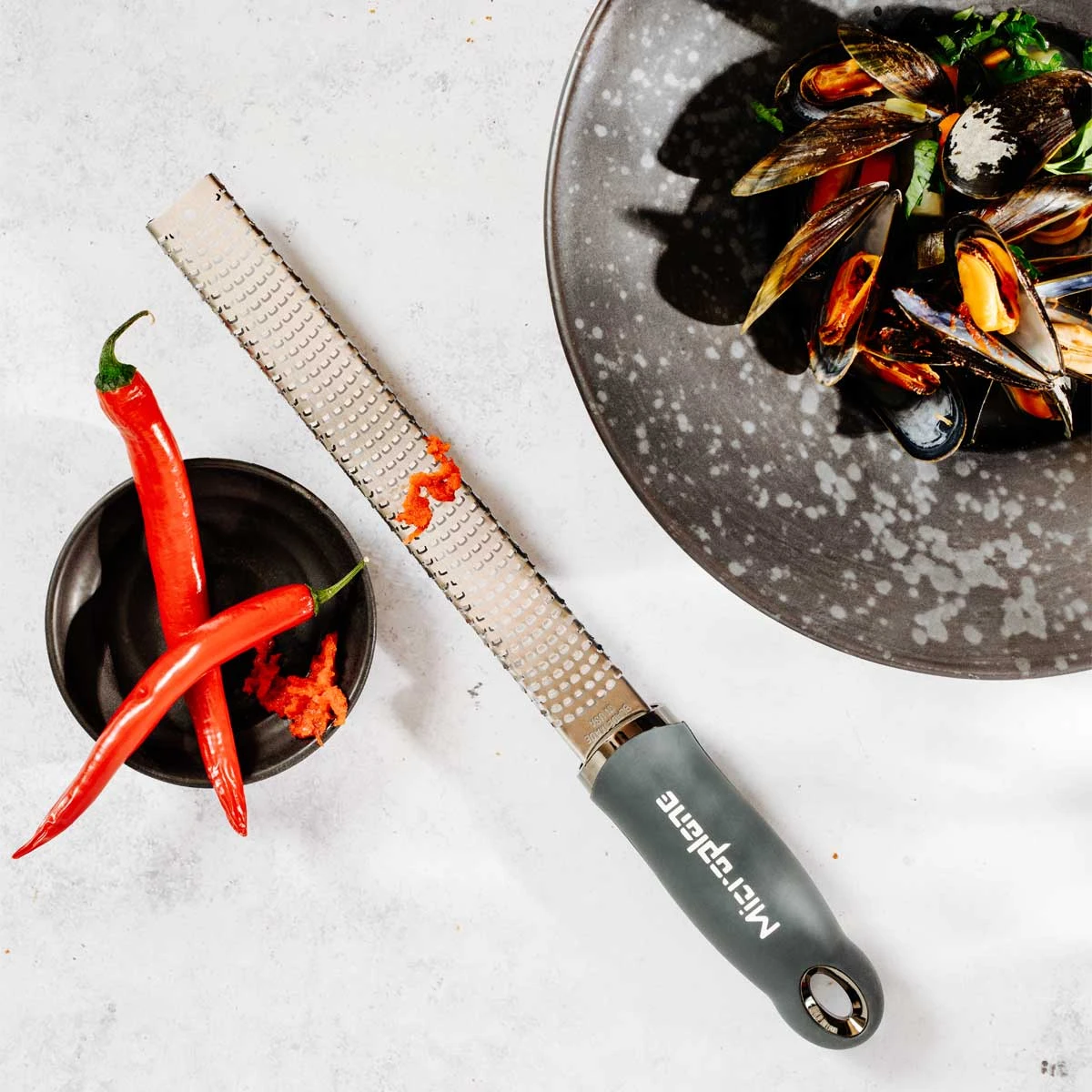 – der Klassiker des US-amerikanischen Herstellers Microplane lässt schon seit mehr als zwei Jahrzehnten die Herzen von Hobby- und Profiköchen höher schlagen. Die Microplane Premium Classic Reibe liefert mit ihrer leistungsstarken Klinge und ist die schnellste und effektivste Art des Reibens.