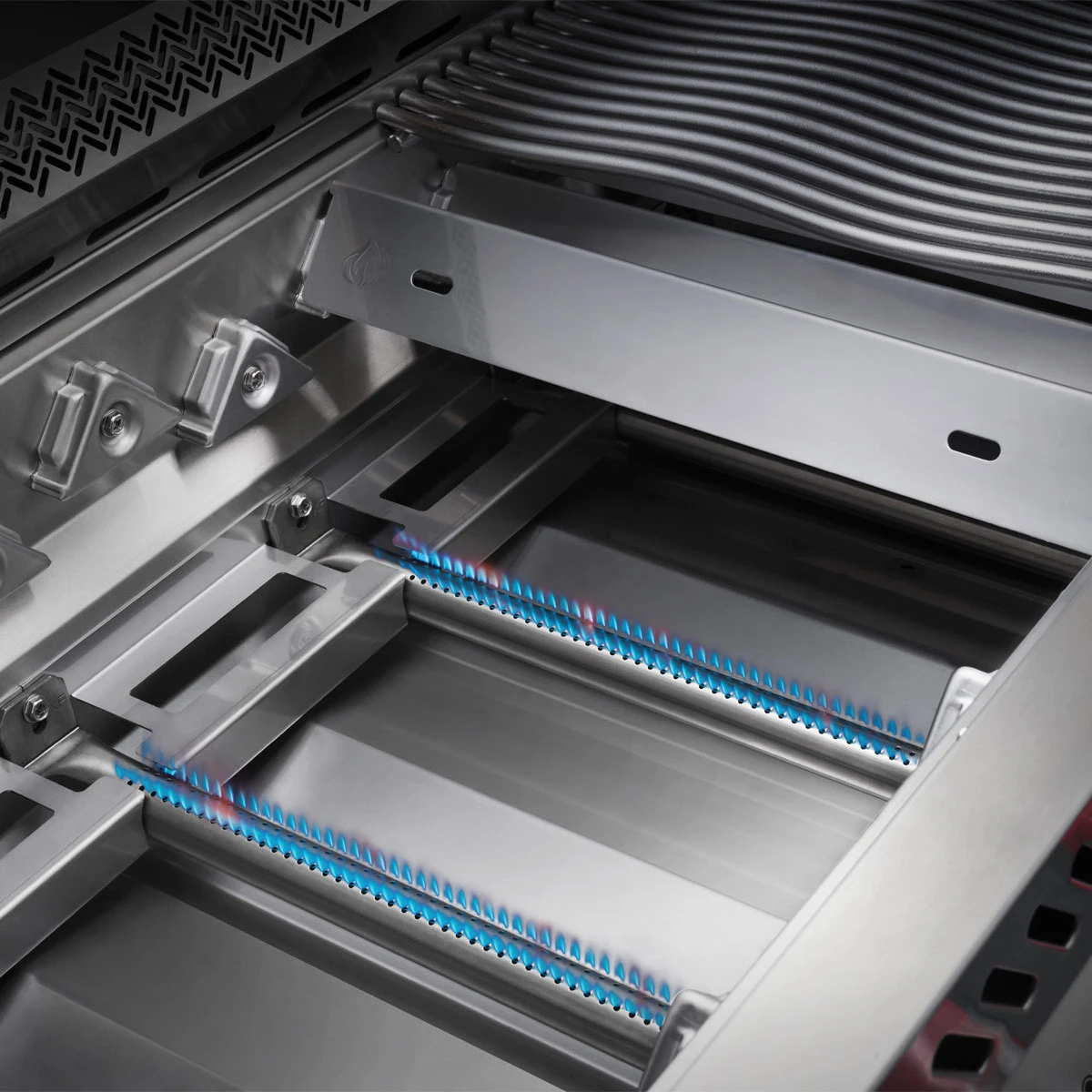 Selbst in der Dunkelheit lässt sich dieser Grill dank integrierter Drehgriff-Beleuchtung präzise steuern. Die Beleuchtung ändert sich bei Gasfluss von blau zu rot, so dass Ihr mit einem Blick erkennen könnt, welche Brenner gezündet sind.