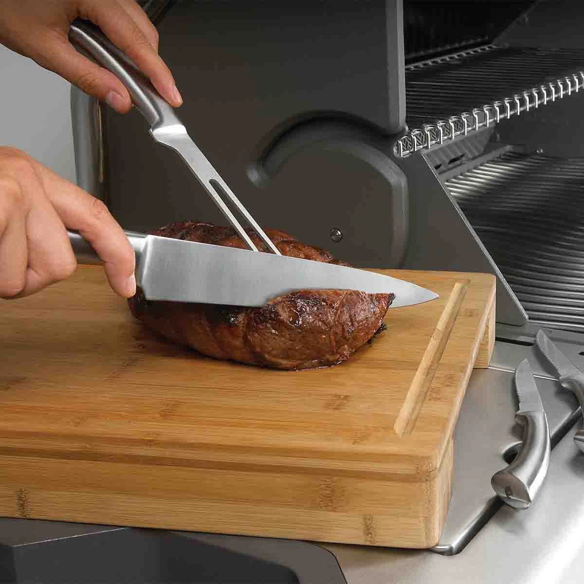 Hier haltet Ihr echte Qualität in den Händen: Das 6-teilige Messer-Set der PRO Series, bestehend aus 4 Steakmessern, langer Fleischgabel und einem Tranchiermesser, zeichnet sich durch eine hohe Verarbeitungsqualität und optimale Ergonomie aus. Durch den verwendeten Edelstahl ist das PRO Messer Set pflegeleicht und robust und die Steakmesser und das Tranchier-Equipment liegen ausgezeichnet in der Hand. Müheloses Schneiden wie ein Profi – ob bei der Vorbereitung, beim Servieren oder beim Verzehr – ist mit diesem Premium Messer-Set von Napoleon kein Problem mehr.